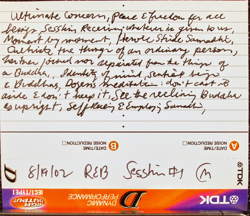 Additional text: Sesshin: Receiving whatever is given to us. Moment by moment. Dogens Meditation: dont cast aside & dont keep it. See the reclining Buddha as upright. Selfless & Empty Samadhi.