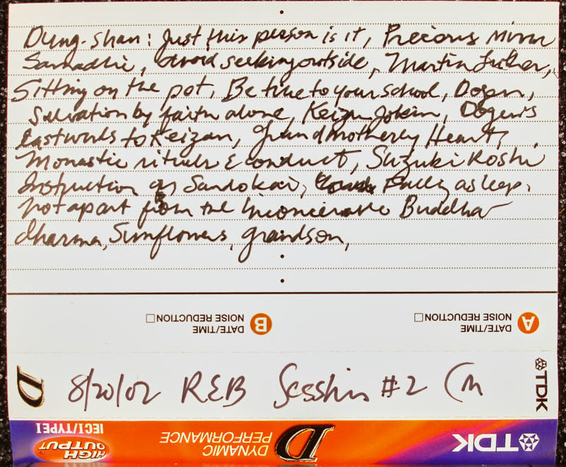 Additional text: Dung-shan: Just this person is it, Rereons nmon Sanbaddie, Glory seeking outside, Martin Buber, Sitting in the pot. Be true to your school, Dogen, Salvation by faith alone, Ken, John. Dogens last words to Keizan. Grandmotherly Heart. Monastic rituals & conduct, Suzuki Roshi. Disfunction of Sanboka, Grave Bulk, asleep. Not apart from the luminous Buddha dharma, sunflowers, grandson.