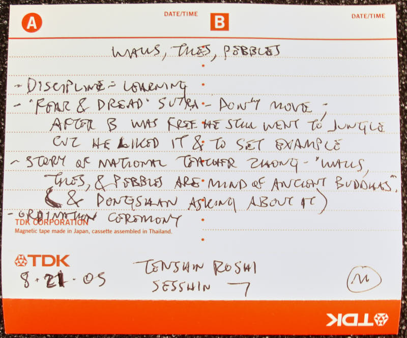 Additional text: - DISCIPLINE = LEARNING\n- ROAR & DREAD SUTRA - DON\u2019T MOVE ;\nAFTER B WAS FREE HE STILL WENT TO JUNGLE\nCUZ HE LIKED IT & TO SET EXAMPLE\n- STORY OF NATIONAL TEACHER ZHANG \u201cWALLS,\nTILES, & PEBBLES ARE MIND OF ANCIENT BUDDHAS\u201d\n& PONGEASHAN ASKING ABOUT IT\n- ORDINATION CEREMONY