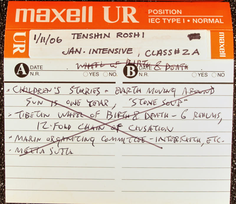 Additional text: 1/11/06\nChildrens stories\nEarth moving around\nSun is one year\nStone Soup\nTibetan Wheel of Birth & Death - 6 Realms\n12-fold Chain of Causation\nMarin Organizing Committee - Interfaith, etc.\nMetta Sutta
