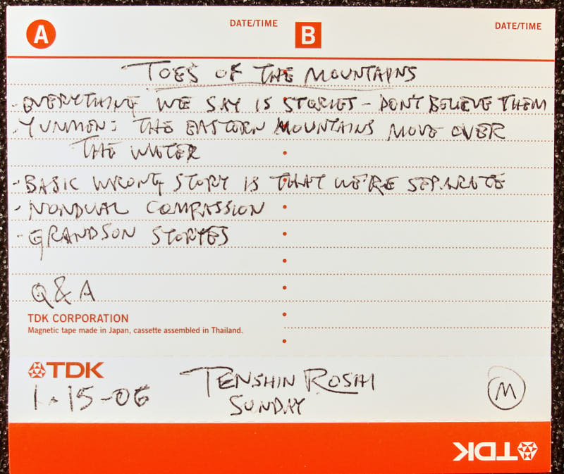 Yeah, Tassajara, yeah. That's why we have Tassajara, for Buddhas to be born. So we have this monastery where you can go and you can jump into that place there where the toes of the mountain splash in the water. And you can join the Buddhas there. Now, there's quite a few stories to tell. And one more story, or several more stories, are the stories of what are called the stories of... When the Buddhas appear in the world, because they're born of this wish to open to the world, to open beings to the wisdom that's joined with compassion, when they appear in the world, they need to meet the people so that in the meeting with the people, this non-dual wisdom,