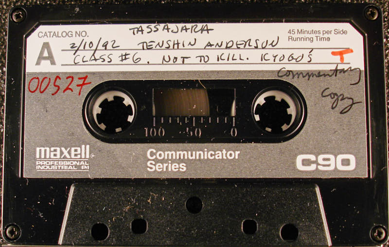 I don't, I don't, I only have one copy here and it's got my scribbling all over it and it's not, it's not, it's on tape, you can listen to the tape, you can copy off the tape. I don't want to release this yet because it's not done and I don't want the, also people might rip it up and destroy it. Eventually I'll make this copy available, that's part of the problem of working with something that you're translating before it's done, it doesn't feel good to have all these, all these partial translations floating around and people having problems with them and you didn't really mean it that way yet, you know, you're not really set on it. Yes? Are you reading us your translation? Yeah. Are you putting it straight in English? Yeah. I read it, I just read it, it's on tape, but I just read it straight one time and I also did it during satsang, but I was commenting all the time in the middle, I don't think I read it straight through very often. If it's, if it seems, if it seems like I'm withholding the Dharma to do it this way, well maybe I should do something different, but I don't mean to do it that way, I don't