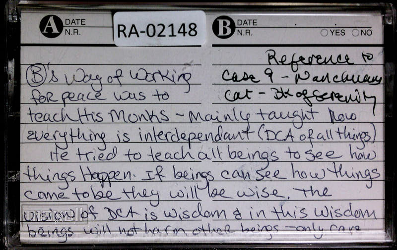 Additional text: A His way of working for peace was to teach his monks - mainly taught how everything is interdependent DCA of all things. He tried to teach all beings to see how things happen. If beings can see how things come to be they will be wise. The wisdom of DCA is wisdom and in this wisdom beings will not harm other beings - only care.