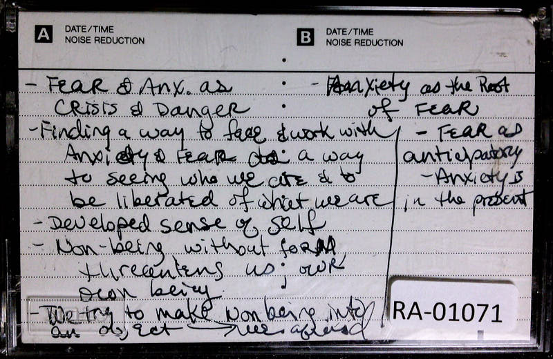 Additional text: Fear & Anxiety as Crisis & Danger; Finding a way to face & work with Anxiety & Fear as a way to seeing who we are & to be liberated of what we are; Developed sense of self; Non-being without form threatening us, our own being; Trying to make our object more friendly