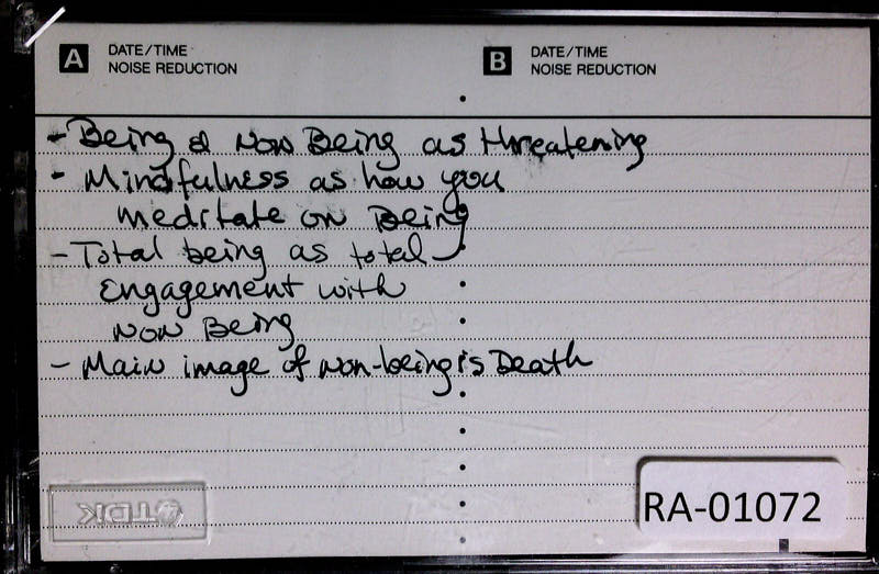 Okay, can you stop there for a second? Sure. Okay. Now, one of the ways we objectify the anxiety is to call it the unknown. It isn't even the unknown, because the unknown is still a way of conceiving of the non-being. Okay? And if the unknown, for example, if our relationship would convert the unknown into something known, and the unknown would drop away then, you realize you still feel anxious. It's not the unknown. I said it a minute ago, but I retract. It's not the unknown. The unknown is still a category we can put non-being into. The thing about non-being is that it doesn't even go in the category of the unknown. Non-being doesn't even go in the category of not being. that's why non-being can go into the category can be here it can be my face it's not my face though you're just using my face to meet this thing and if you can open up to this face as a symbol not of anything else like on the unknown but as a symbol of non-being which is your you know what gives you life
