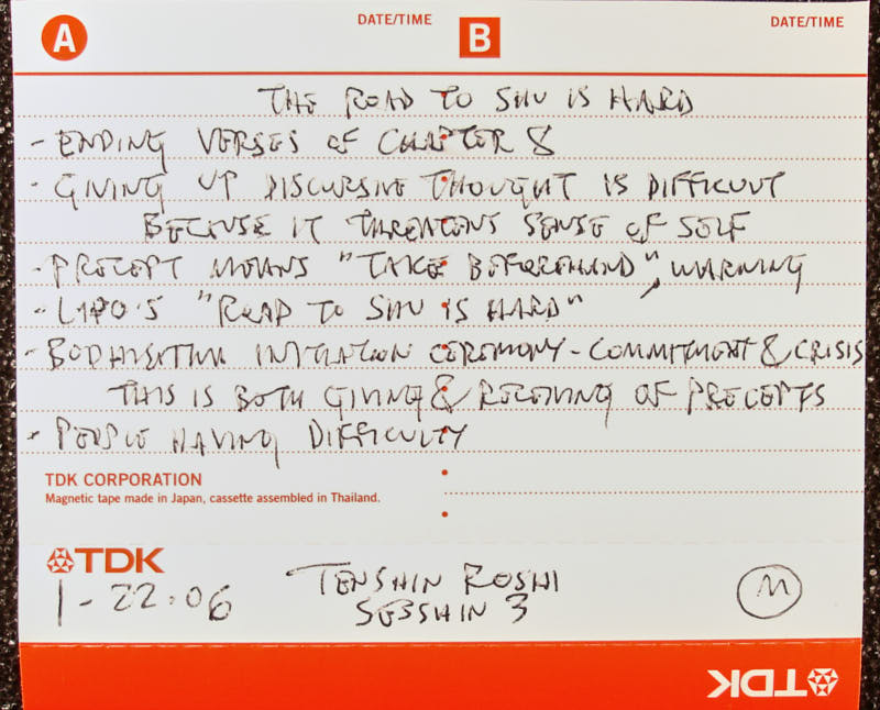 feel invited to assist you, whereas if you tell them and make this commitment and put yourself in that container of them knowing you want to practice this, then they can help you. So then it's harder, because they're all helping you. They're all saying, well, how is that the precepts? How is that kind? How is that helpful? They help you. It's harder that way, actually. And also, yeah, it's harder, but it's more successful. It's the path of liberation. The ceremony is called tokudo, which means attaining or touching liberation. Toku, to attain, do, and this do is not the do of the path, it's the do of crossing over samsara