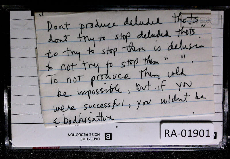 Additional text: Dont produce deluded thoughts, dont try to stop deluded thoughts. To try to stop them is delusion. To not try to stop them. To not produce them would be impossible, but if you were successful, you wouldnt be a bodhisattva.