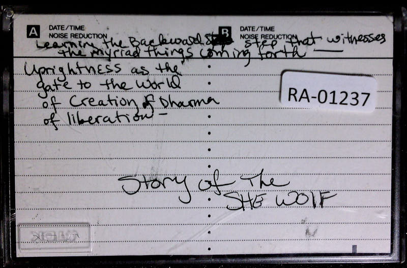 And we take refuge in the Sangha. We take refuge in Luosan's uprightness, in his dropping away a body and mind and just saying and hearing who's a rising and vanishing of pain, of birth and death. I want to tell you a long story now It's a hundred-page story. It's about a she-wolf, a pregnant female, well, pregnant wolf.
