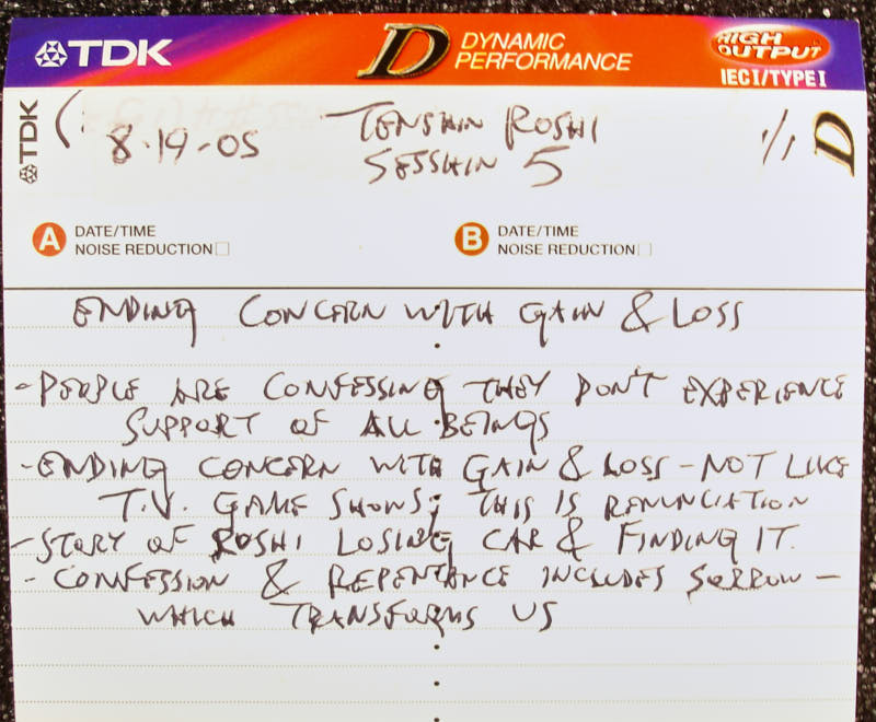 Additional text: Ending concern with gain & loss. People are confessing they dont experience support of all beings. Ending concern with gain & loss - not like TV game shows; this is renunciation. Story of Roshi losing car & finding it. Confession & repentance includes sorrow - which transforms us.