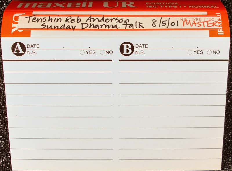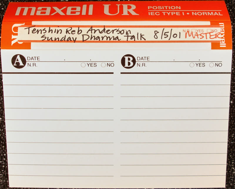 today is our senior dharma teacher, Tenshin Rev. Anderson. He'll be back in here for a question and answer period in just about 25 minutes. If the people who need to leave right now to get the tea could just go ahead. We'll be having tea and muffins, I believe, out here at the side of the Zendo for the next 20 minutes or so. I'd just like to mention a couple of things that are going on in the next week or two this month. One of them is going to be an introductory sitting. It's led by Maya Wender and that will be on August 11th, Saturday. You can get more information about that in the office. That's a good opportunity for people who haven't done very much extended sitting but who are interested in finding out maybe what it's like. Then also that weekend on the 12th is a tea gathering, a monthly