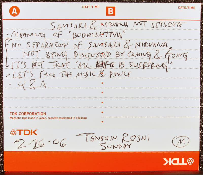 Additional text: Morning of Bodhisattva, No Separation of Samsara & Nirvana, Not Being Disgusted by Coming & Going, Its Not That All Life is Suffering, Lets Face the Music & Dance, Q&A, Sunday