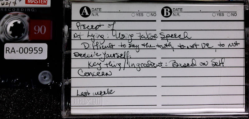 Additional text: Precept of not lying. Using false speech. Difficult to say the truth, to not lie, to not deceive yourself. Key thing/ingredient: Based on self concern. Last week.