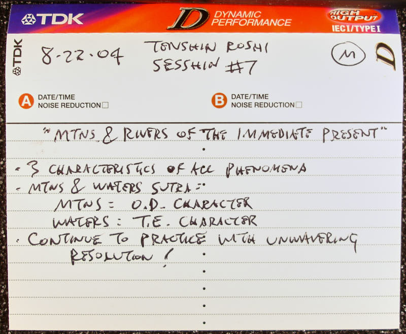 Additional text: Sesshin #7, 3 characteristics of all phenomena, Mt. & Waters Sutra: Mtns = O.D. character, Waters = T.E. character, Continue to practice with unwavering resolution!