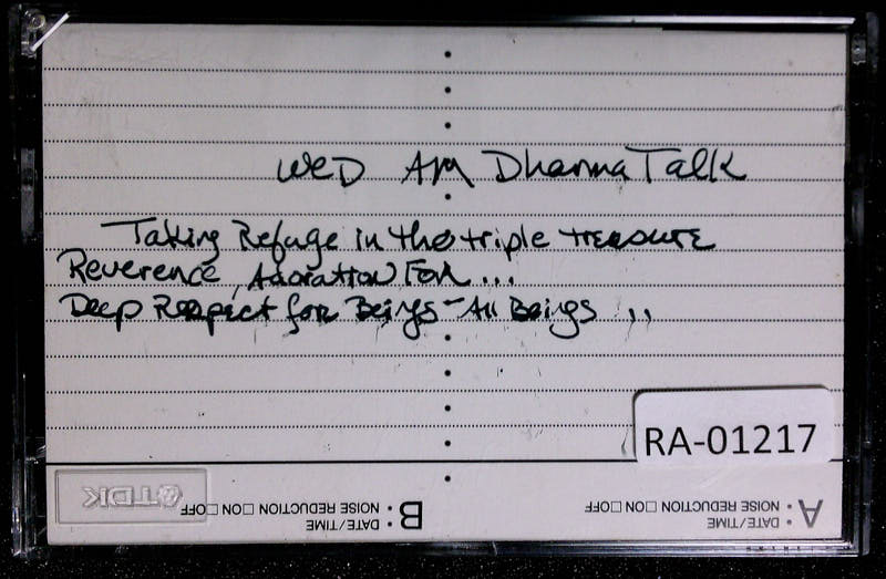 They're the same thing. Respecting your mind, respecting all living beings, respecting Buddha. This is total devotion to a mobile sitting, to be unmoved, to be devoted to not moving, in enlightenment of you, of everybody else, and of course of Buddha. The Buddha of you and all beings to be unmoved in that oneness. And to take refuge in that oneness is to take refuge in the Dharma. Again, one time somebody asked Suzuki Roshi's wife, who was the principal of a Buddhist kindergarten associated with Suzuki Roshi's temple.