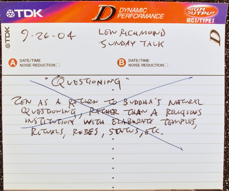 They're not trustworthy, but they're trusty. My trustee attendant reminded me of two things, but does he know what they are? No. Two things are. One thing is, in these discussions, sometimes they go on and on, and so don't feel trapped in the room. If you need to leave for some reason, don't feel that you have to stay for the whole event if it goes on a long time. If you need to leave for some reason, please you may leave. Usually we don't leave during Zazen periods, but they're usually only maximum 40 minutes, unless the person who's ringing the bell forgets to look at the clock or falls asleep, then they sometimes go on for several hours. But, you know, still, these talks can go on and if you need to leave, you can leave. Or not even if you need to, just if you want to, you can go.