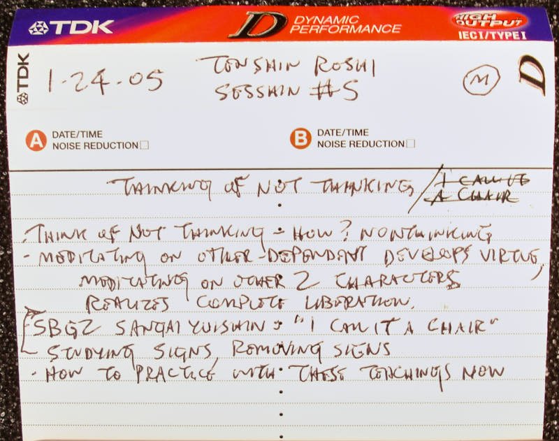 Given a lot of attention during this sesshin to training in tranquility and some discussion of what the state of tranquility is like. And how it is in the Yogachara tradition how it is considered to be a necessesary foundation for successful training in wisdom. And I was going to talk a little bit today how to turn; how the mind can turn then from the training in tranquility, where we give up discursive thought, where we are giving up involvement with the images that are appear before us. And in giving up involvement with the images before us we are actually attending to the image maker, the mind which is contemplated by all minds. But I also just want to mention that, it seems that in the – in some places in the writings of Dogen, you find expressions like this; - you find expressions like. I believe in this text I have before me, the ‘Zazenshin’ the acupuncture needle of Zazen is an expression: ‘the vain programs for suspending considerations, suspending discursive thought and congealing in tranquility. Vainly endeavoring to cease thought and become absorbed in serenity.’