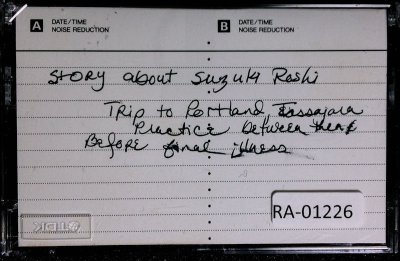 Last Saturday, I went to the Monterey Zen Center, Zen Group, and did a workshop. And the workshop was a benefit to raise some money to develop an archive of Suzuki Roshi's talks, tapes, and lectures. The suggestion was that I spend the day recollecting and reminiscing about Susie Drush's life and that we have alternating periods of meditation and recollection. I wondered if I would have enough to say.
