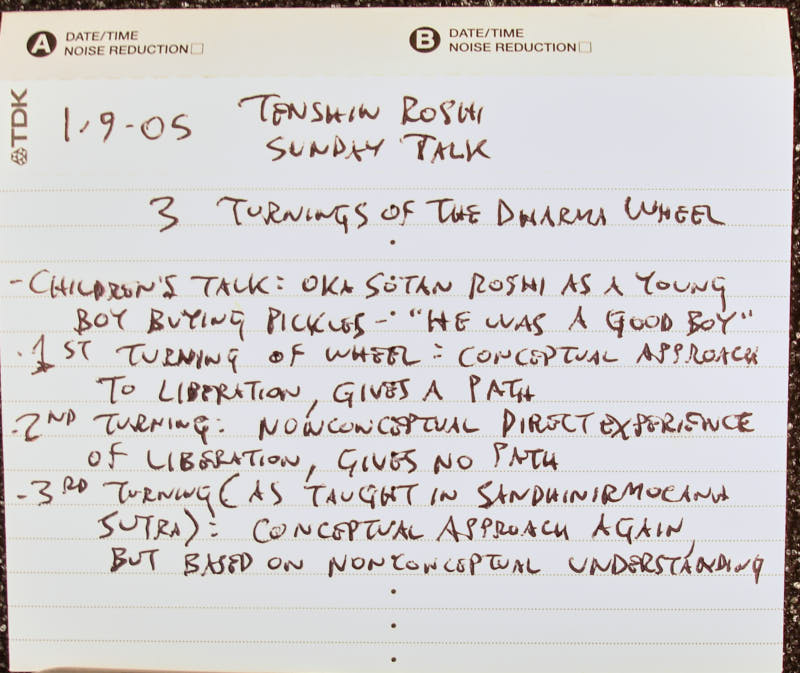 Additional text: 3 Turnings of the Dharma Wheel. Childrens Talk: Oka Sotan Roshi as a young boy buying pickles - He was a good boy. 1st Turning of Wheel: Conceptual approach to liberation, gives a path. 2nd Turning: Nonconceptual direct experience of liberation, gives no path. 3rd Turning As taught in Sandhinirmocana Sutra: Conceptual approach again but based on nonconceptual understanding.