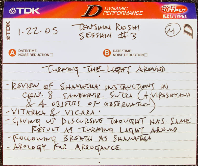 Additional text: - Review of Shamatha: Instructions in Chan. 8 Sandhinir. Sutra Vipashyana & 4 Objects of Observation - Vitarka & Vicara - Giving up discursive thought has same result as turning light around - Following breath as Shamatha - Apology for arrogance