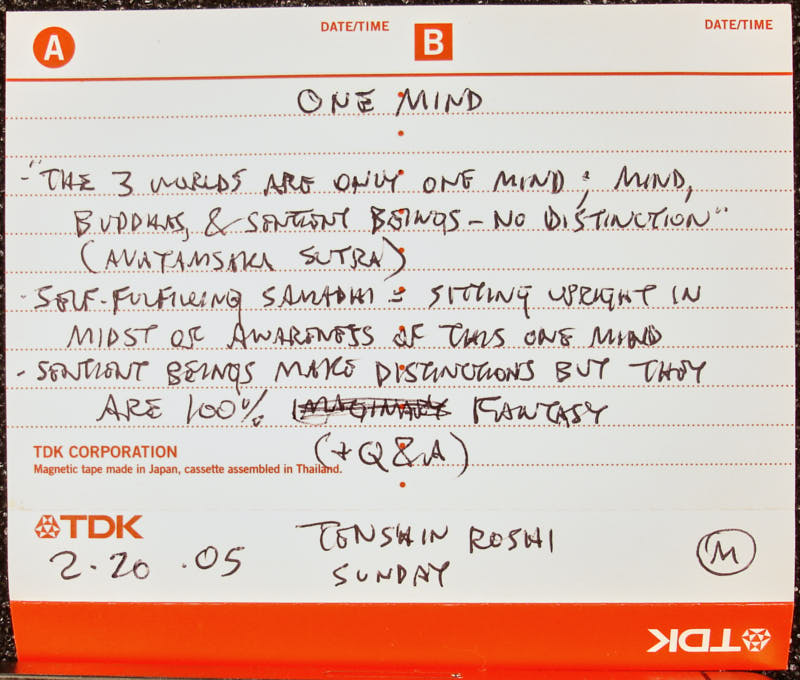 and totally embraces the one mind, totally embraced by the whole natural world and all living beings and Buddhas, and totally embraces all living beings, all Buddhas, all worlds, the mountains, the rivers, and the great earth. Which embraces being chosen, then, to wipe a butt, or not chosen. Which enters the mind, which gives up the distinction among things, right while the distinctions are there, because this one mind includes all distinctions. And how does it include all distinctions? In the understanding that they're just fantasies