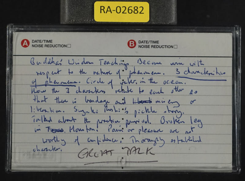 Additional text: Buddhist Wisdom Teachings: Become one with respect to the nature of phenomena. 3 characteristics of phenomena. Circle of jewels in the ocean. How the 3 characters relate to each other so that there is bondage and liberation. Suzuki Roshi\u2019s pickle story, talked about the practice period. Broken leg in Tassajara mountain. Pain or pleasure are not worthy of confidence. Thoroughly established character.