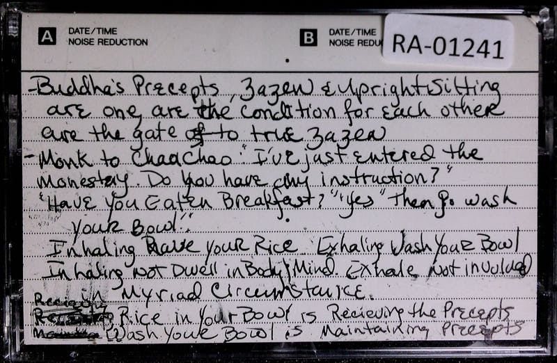 Even to say they're two sides of the same coin is perhaps creating too much separation. And yet we can speak of the precepts and sitting. the precepts and zazen. In a way they're conditions for each other. The precepts are the gate to what we call true zazen. Practice of zazen helps us understand the precepts. As I recited this morning, long ago, a monk came to see the great teacher, Zhaozhou, and said, I have just entered his training house.