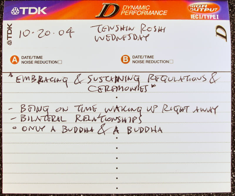 expression for this precept they use a term for regulation or laws, and they use a term for ceremonies or rituals, so it's two together. But they're also kind of very closely related. So I just thought I might mention to you, since some of you probably already know this, but I just thought I might list a few of the forms and ceremonies that we practice, both during practice period and also not during practice period, but during practice period they can be intensified, because the people in practice period do less kind of manual labor and a little bit less work than during ordinary Green Gulch time or Zen center time, a little bit more time for paying attention to these regulations and ceremonies. The ceremony that I came to Zen center to practice, which I didn't think of it as a ceremony