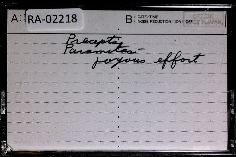 This precept of not killing life is the first of the Bodhisattva's Sambharashila. The next section of Bodhisattva precepts is to gather together all wholesomeness. And this is the six perfections of giving ethics, patience, joyous effort, concentration, and wisdom. And the last precept is the precept of serving others, of devoting one's life to the welfare of all living beings. These precepts are in order, one, two, three. Usually you start with the precepts of restraint, then go on to the precepts of the six paramitas, and then serve beings.