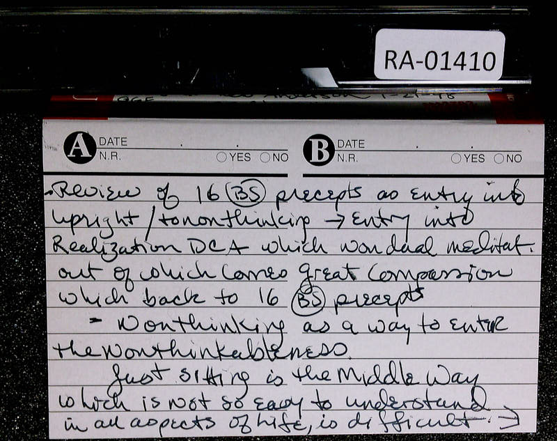 Additional text: Review of 16 precepts as entry into upright/nonthinking. Entry into Realization DCA which would lead meditatively out of which comes great compassion which back to 16 precepts. Nonthinking as a way to enter the nonthinkableness. Just sitting is the Middle Way which is not so easy to understand in all aspects of life, is difficult.