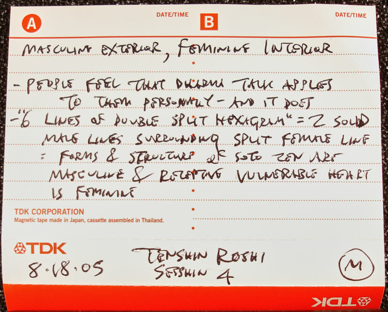 Additional text: Masculine exterior, feminine interior - People feel that Dharma talk applies to them personally - and it does - 6 lines of double split hexagram = 2 solid male lines surrounding split female line - Forms & structure of Soto Zen are masculine & resting vulnerable heart is feminine